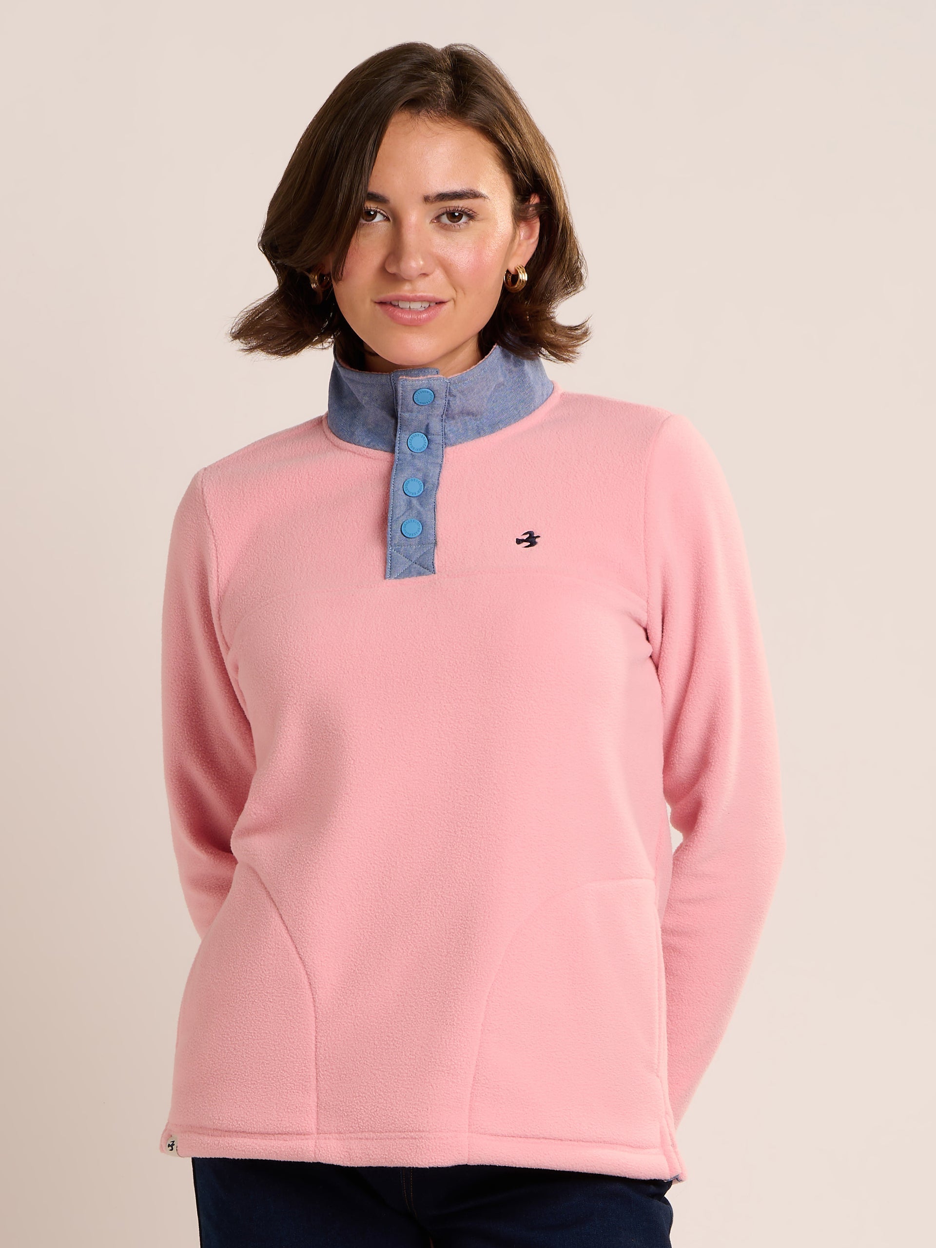 Stay warm in style in our Trent popper neck fleece, featuring a contrast chambray neck and placket with branded poppers, perfect for keeping warm and cosy. The fabric is soft and warm in the perfect shade of pink perfect for layering on cooler days. The fit is relaxed so you can layer and features hem vents so you can move. Shell 100% Polyester