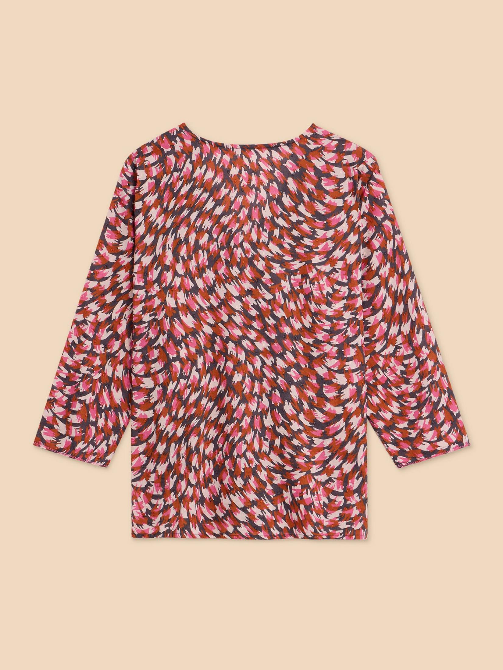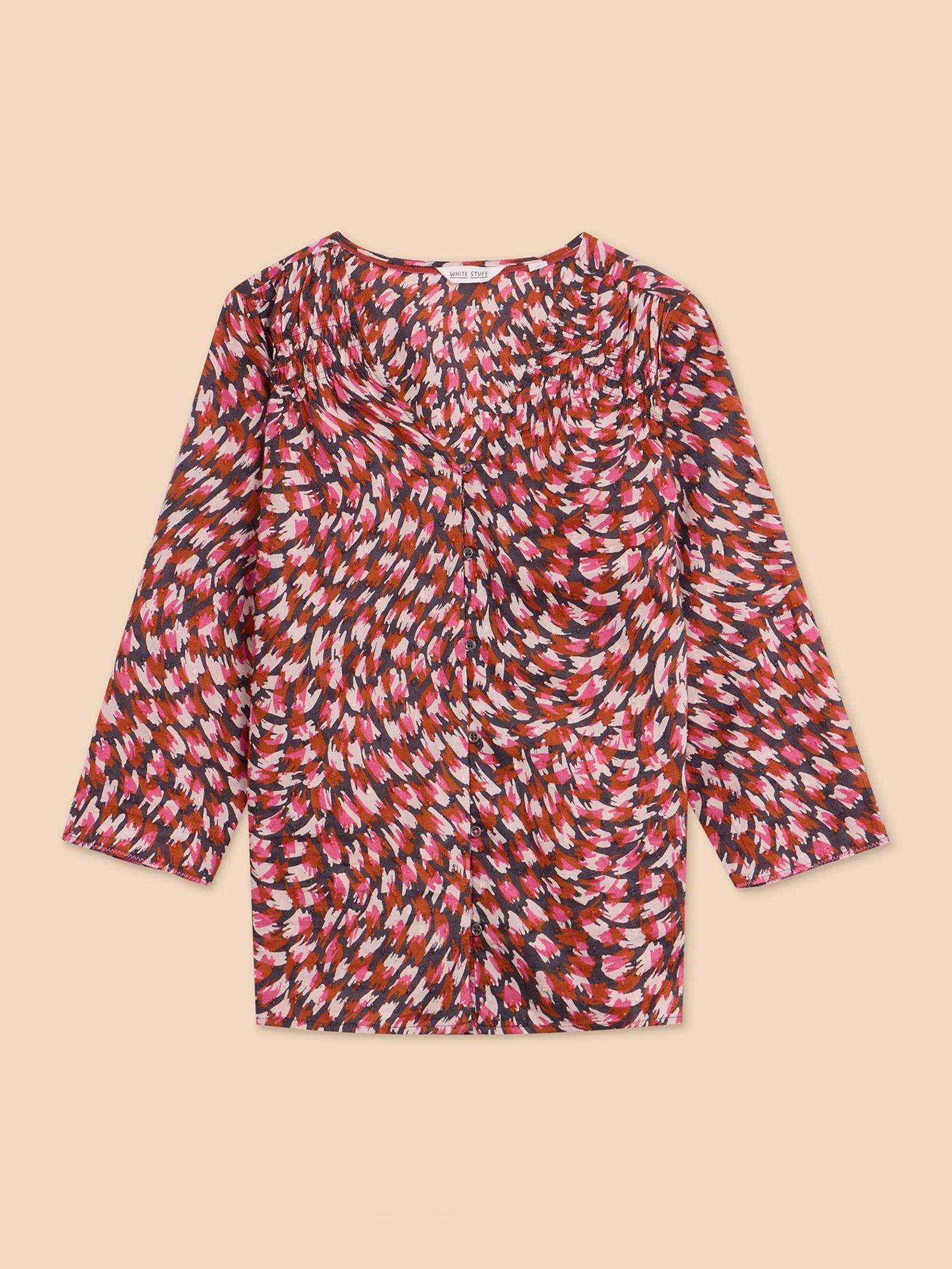 A button-up v-neck with pleated shoulders and an eye-catching print. This top loves attention to detail.