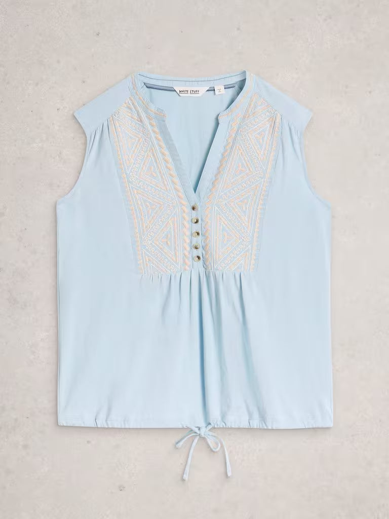 White Stuff Sleeveless Collared Shirt in Mid Blue